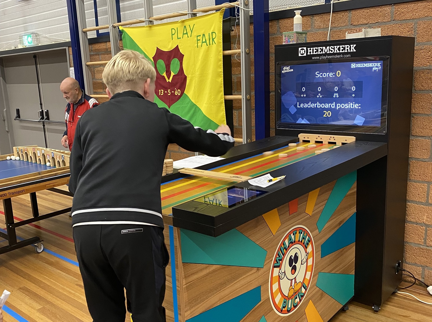 Heemskerk was weer van de partij. Vorig jaar was er de gloednieuwe attractie: het ‘digisjoelen‘, een sjoelbak die automatisch je punten telt. Dit bestond nog nauwelijks op de markt, maar stond wel bij Play Fair! Dit jaar kwam Heemskerk met de vernieuwde versie. Daarnaast was er een gloednieuwe attractie: een  American Shuffleboard! Dat is een curlingspel op een tafelmodel!